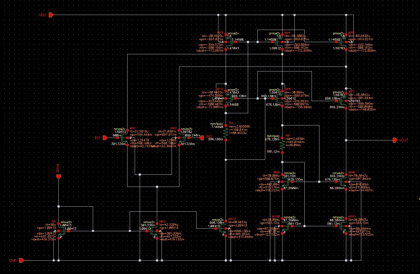 谢谢大神指点,可是我重新定的设计指标,由于功耗很小为<0.16mw,所以我选输入管下的偏置电流为30uA,其他三条支路都为15uA,可是仿真出来的其他参数都达到目标,就是MN11和MN10处于线性区,改变电阻翻倍也不行,是不是我的MP4、MP5选小了呢,如果将MP4、MP5的电流选大些(其他支路的电流就会相应减小)我的Av又上不去。求指教啊。