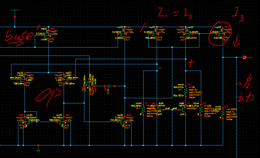 图中的基准电路改中Verf产生的电路部分上的最后一个PMOS不知道为什么它的电流不和前两个一致,而且他们的电流是由下面的I=VBE/R7+(VBE1-VBE2)/R11, 得出与温度无关的电流,对应的求出R11与R7的比值,其中R7=R12。我仿真结果看这俩PMOS都在饱和区,为什么前两个没事,最后一个I3怎么不和前面相等?而且我改变电路中的R13,对最后一个PMOS没什么影响,它还是没在饱和区。