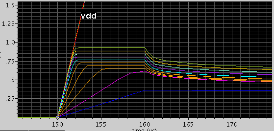 我将电路中的电容值设成参数,激励模拟一个电源的上电过程,然后进行瞬态参数分析,波形图中的各条曲线由下到上分别是电容值由小到大变化得到的,我不明白这波形是这样的,能帮我分析分析吗