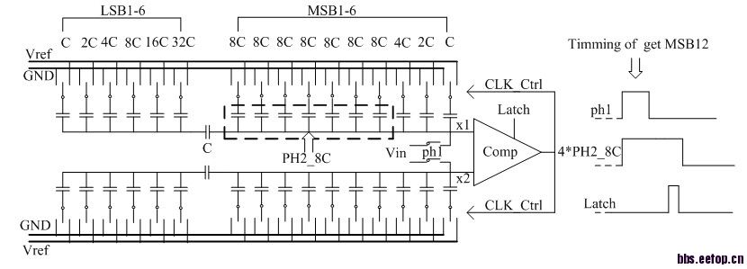 这种方式采样方式好像叫上极板采样!这种采样方式使电容阵列减少了2^N/2,而且较小了电容再分配时的功耗