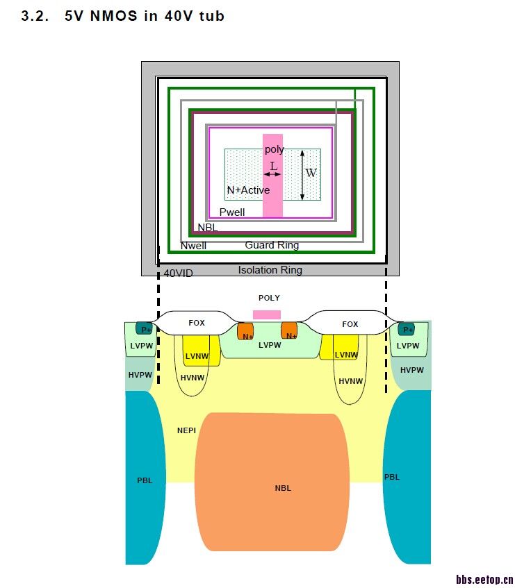 一般高压隔离型5V管也能实现GGNMOS或者GDPMOS吧?结构和一般的标准5V管类似,只是在高压nwell/nbl里。