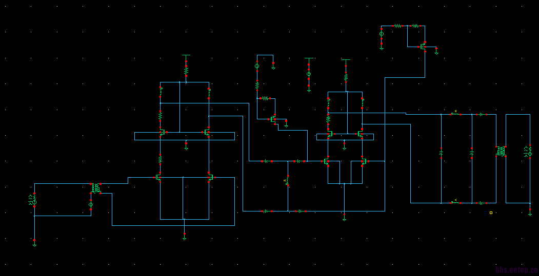 仿真电路包括两级,两级都是cascode结构,第二级使用了电容补偿。输出匹配时pi型结构,级间匹配是T型结构,输入没有做匹配。