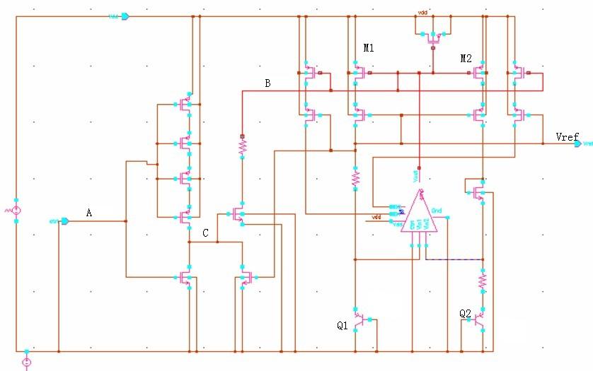 [local]1[/local][local]1[/local]电路左边是启动电路。启动后C点电压为0,B点的电压也被放大器拉低仅为49mV。放大器的两个输入端电压差别很大。很明显放大器没有正常工作。Q1,Q2的电流分别为100多个uA,和30多个uA。远高于正常工作时的电流。