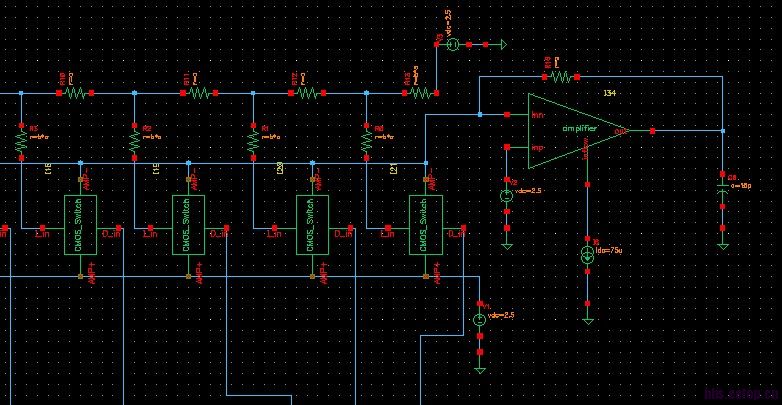我用的是0.5um工艺,然后是5v供电。因为本来R-2R结构,放大器反相端接反馈,正向端接地,但是DAC输出是负的电压。所以改成正向端接2.5v电压,然后R-2R结构再做些改变。使得DAC输出变为9.7mv--2.5v.因为我还没想出输出0-5v的电阻比例的DAC方案。现在我的理解是,由于引入了负反馈,我的放大器的两个输入端应该一直都是2.5v的电压。所以我认为没有超过共模范围,不知道这样理解是否正确。