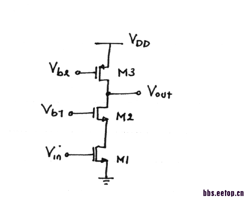 因为M1截止,M3深度三极管区,则Vout为VDD。若M2为P管的话,M2处于截止区。若为N管,则M1漏为不定态,不能根据b1判定M2的工作状态吧.