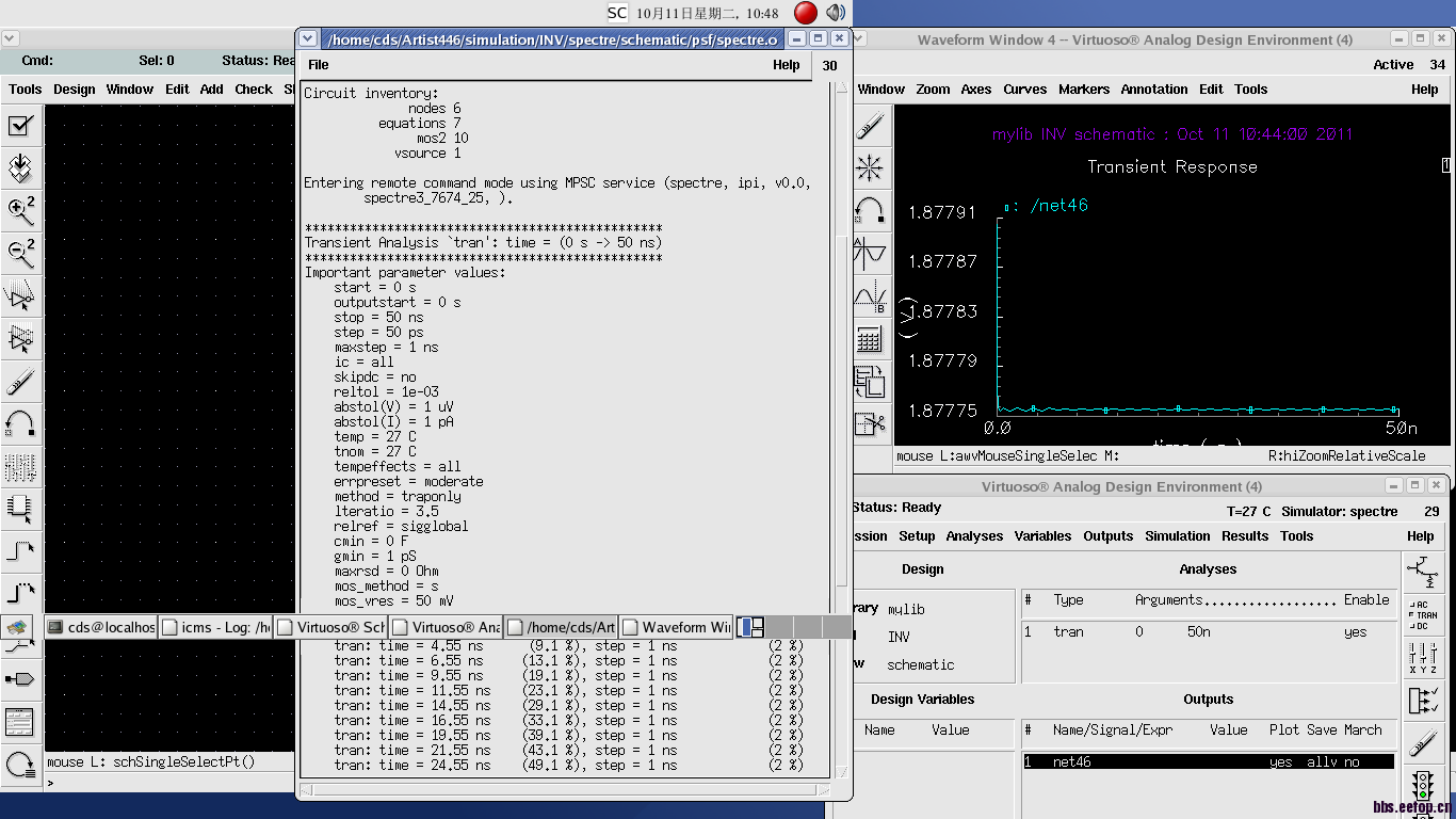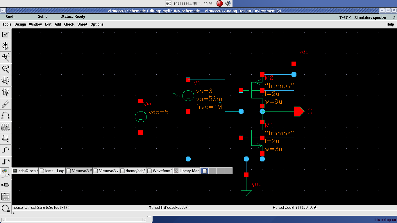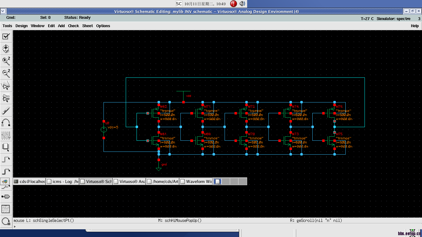 Cadence下的single ended ring oscillator仿真,5-stage,w/l=900n/600n,vdc=5V,不起振呀,有时候把电压改小点能起振一小段,而且stop time 50ns以内,但是把stop time 一改大点就又不起振了。
