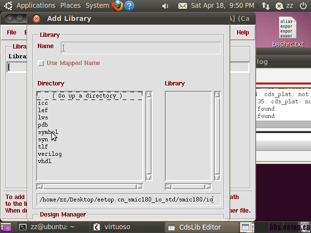 我在Ubuntu12.04下安装了IC610,在论坛里下了smic180 io std库,可是下完之后,按照一般的方法,在icfb CIW窗口点击Tools-->Library Path Editor ,选择我下载的库文件夹,里面没有能装的库啊?Library显示都是空的。