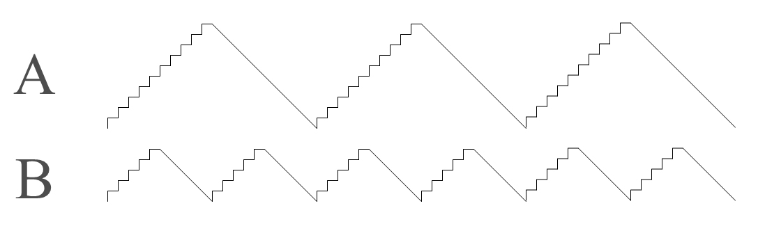 如图的两种PFM输出波形,上升和下降的斜率都一样,上面波形A纹波和周期为波形B的两倍,那这两种PFM效率有明显区别吗?谢谢!