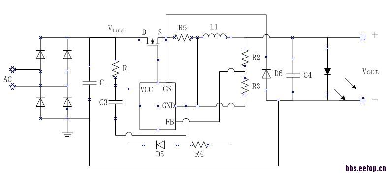 Buck架构,芯片是浮地状态,但是外围有些怪,D6的阴极应该接在R5和L1之间。