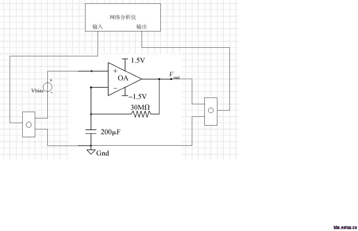 这次流片,流了个运算放大器(单电源),但是测试的时候遇到问题了,还不知道如何测试? 现在手上有电源,示波器和一个网络分析仪,安捷伦的E5071,请教大神,。 在一个paper上看到一种方法是如下图测试方法,不知道对不?