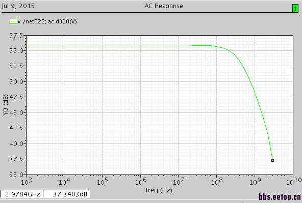 搭了个跨阻放大器,电路图如图,交流仿真显示跨阻增益为55dBΩ,即500Ω的样子。现在输入5uA电流,输出电压峰值本应为2.5mv左右。实际仿真结果峰值却为2V,是仿真有问题?还是电路结构有问题?