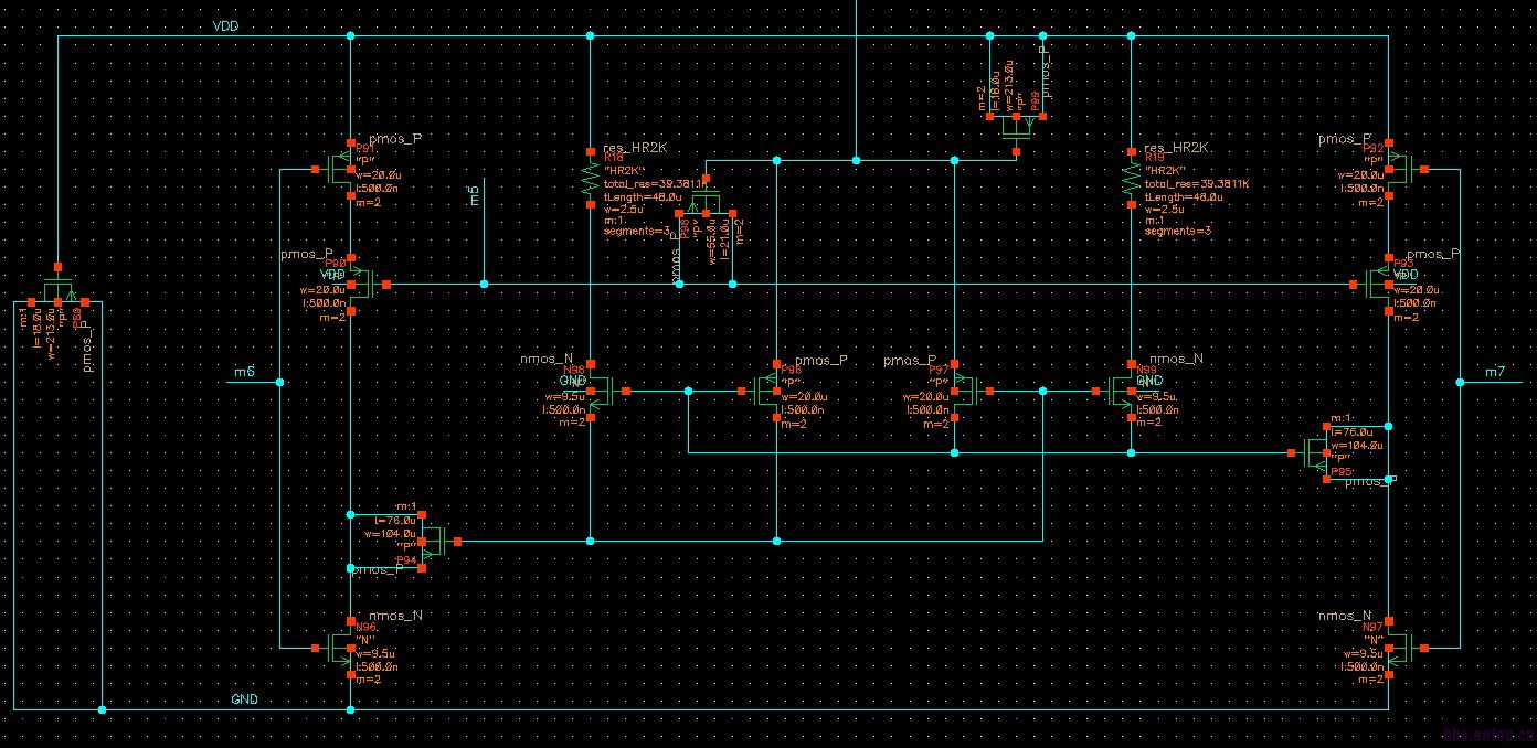 m6和m7是非交叠时钟信号,引出去的那根线和m5分别是差分运放的输入和输出(双入单出运放),再具体点就是,引出 去的那跟线通过 电阻分压给到运放的一个输入端,再由输出反馈给m5。