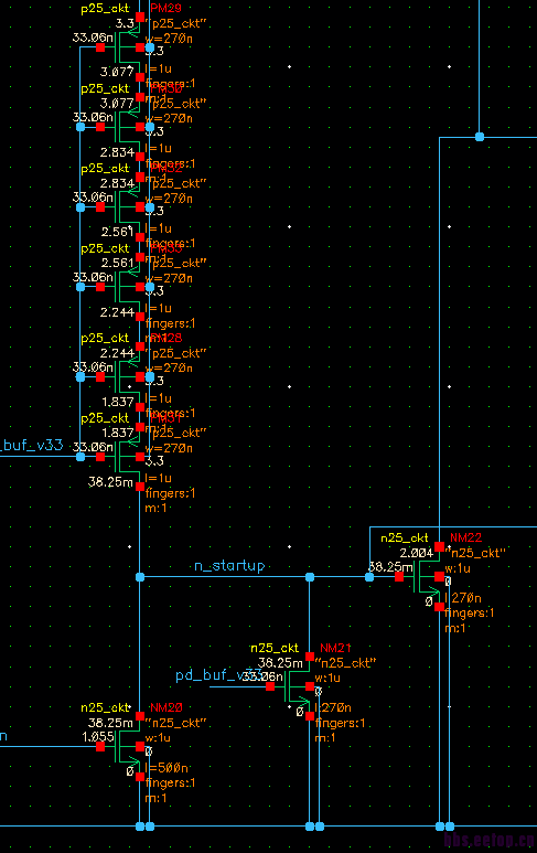 但是流片回来发现,当电源电压小于2.5V时,基准输出为高,只要给电源慢慢地调高到2.5V,输出就正确了。