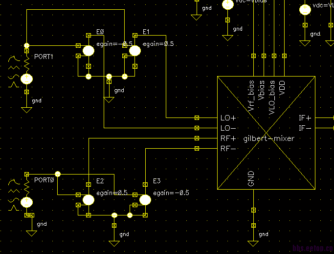 我的本振信号,射频信号,中频输出都是差分的。本振的差分利用俩个VCVS,其增益分别是0.5和-0.5,实现了差分信号,射频的差分信号也是这样实现,如图