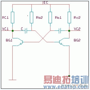 3.开机:由于电路参数的微小差异,和正反馈使一支管子饱和另一支截止.出现一个暂 稳态.设BG1饱和,BG2截止.