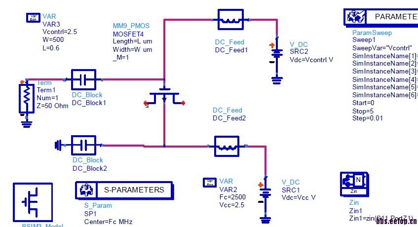 如图所示,是测试mos管的电容随电压变化的特性曲线,那这些dc_feed和dc_block有什么作用,和普通的电容电感有什么区别?