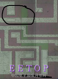 图二是金属层,图一是染色层,只有这两层,采用的是双极型工艺。请问这是个什么器件呢?图中绿色的两个条痕是什么有什么作用呢?谢谢!