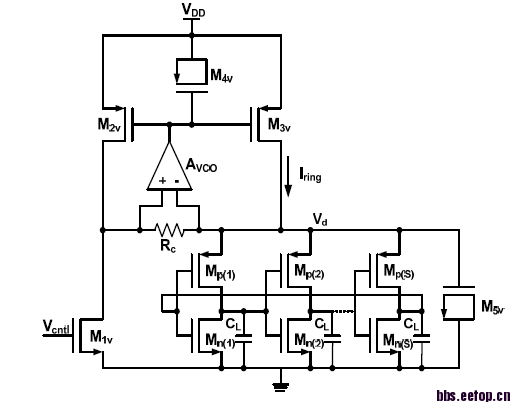 运放的选取主要还是看对这个电路的指标要求...然后再来推运放的指标要求...理想运放当然是可以的了...Rc的取值我认为要从两个方面来考虑..首先是VCO的建立速度...因为Rc(我认为主要决定了反馈的强度)如果太小,那么反馈较慢,这样电压改变很久之后才会稳定...同理如果太大必然会造成PMOS栅极电压的抖动..具体取值应该需要定量的去分析了吧....还有就是这个Rc会不会还与右侧的MOS电容组成一个时间常数t...来稳定反相器的供电电压?