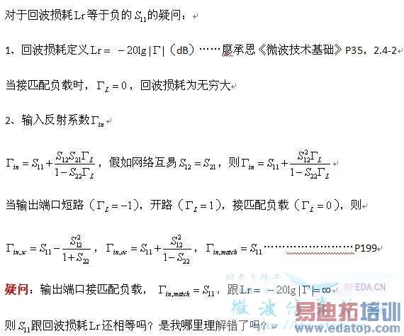 匹配负载回波损耗为无穷大,完全失配时为零,这就是回波损耗的定义。谁说的S11跟回波损耗相等?回波损耗Lr=-20log(abs(S11))