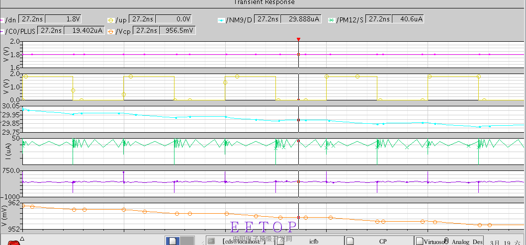 做CP时,设定电流为30u,匹配曲线如下,因为没有运放,只用共源共栅,所以仅仅调到这个范围。