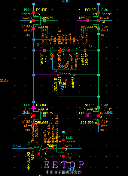 向各位求教一下,观察VCO输出瞬态,发现输出两端波形幅度不一样,开始以为是电路中哪个管子设置时没注意,不对称造成的,后来发现是电感的问题(电感左右位置调换一下,输出的波形也跟着调换了,所以确定是电感问题),电感使用我使用的工艺库提供的电感,这种电感带来波形不对称的具体原因有没有谁可以解释一下。