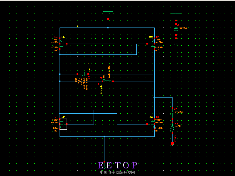 电源电压是1.8V,电路结构是最简单的mos耦合,尾电流源只给了2mA。主要是不知道大家都是怎么计算尾电流源的,我是凭感觉自己给的。