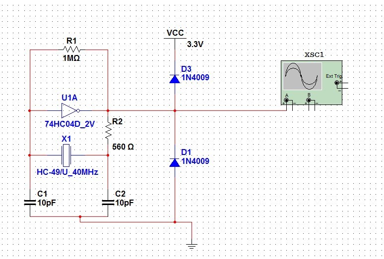 最近在使用一个皮尔斯振荡电路来产生时钟信号,仿真还是可以的,但实际测试的时候就成了类似正弦或者三角波了,哪位有没有遇到相似的情况?电路如图所示: