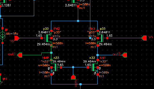 小编发的那个全差分电路,输入管的栅极接1.65V电压是可以的,但N管NM0和NM1的栅极电压太大了,结果把输出节点out1和out2的电压下拉,导致NM0和NM1工作在线性区,整个放大器的增益应该很低。