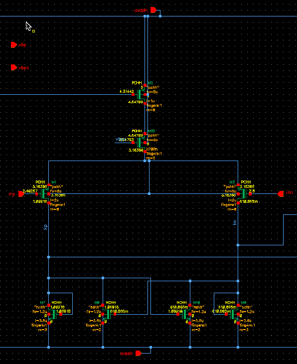 如果所示比较器输入级,共模输入范围Vinmax=Vdd-Vds2-Vds1-Vth1=5-0.15-0.16-0.53=4.16V