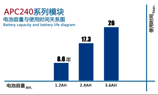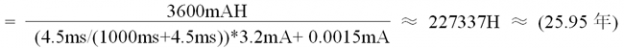 例如:电池是3.6AH锂亚电池,APC240接收电流为3.2mA,休眠电流1.5uA。射频传输速率10Kbps,无线唤醒周期为1秒,唤醒搜索前导码时间平均约为4.5毫秒,那么,