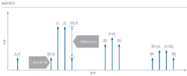 为了理解IMD,我们需要回顾一下非线性系统的多音信号理论。虽然单音激励信号会在该信号频率的每个倍数处产生谐波行为,但是多音信号产生的非线性产物需要在更宽的频率范围才会出现。