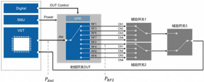 在之前提到的插入损耗和隔离度的量产测试中,射频开关芯片的多个通道之间测试进行切换而需要最大化复用仪器,因此我们使用辅助开关模块对测试系统进行设计。