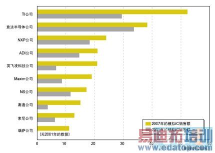 总的来说,美欧公司对模拟技术看得准、抓得快。因此,根据iSuppli(日本)公司的调查,2007年全球10大模拟半导体公司中,美国独占5家,欧洲3家,日本则因一边倒的偏向数字化并弱化模拟技术而仅存居末位的2家(见图3)。