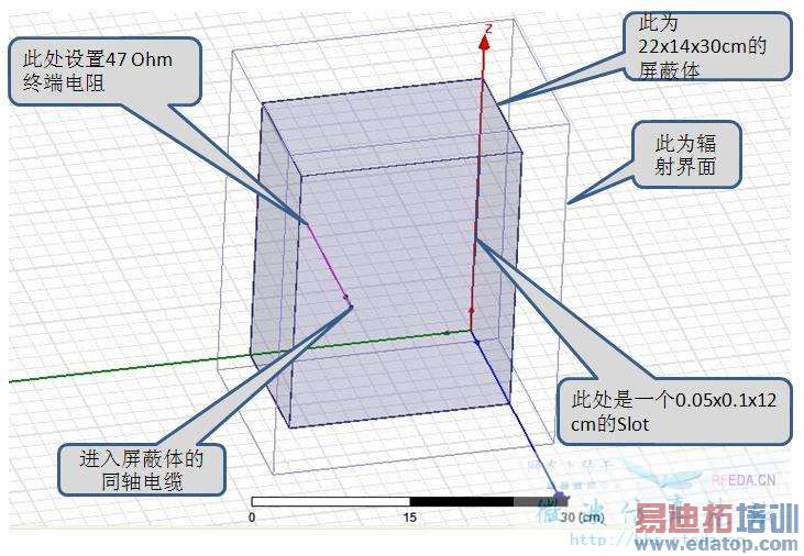 该实例仿真的是一个屏蔽体的屏蔽效果。