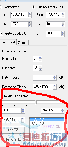 楼上说的在耦合矩阵中自己加,以四腔的滤波器为例,1和4腔加磁耦合,即加虚数零点,你在耦合矩阵中,让m14这个矩阵元不为0,并且为正,因为正才是磁耦合....这样就相当于加了虚数零点了....
