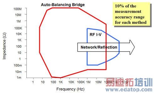 阻抗分析仪和LCR表是非常通用的测量器件的电子仪器。根据阻抗范围和频率范围的不同,有一系列不同原理的仪器来满足测试要求,图1是不同阻抗范围和不同频率范围的阻抗测量方法。