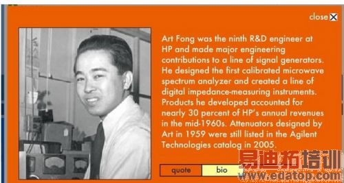 最近在翻阅HP的历史的时候,在timeling里边发现了一位看起来像华人的Art Fong,我被他的成就所震撼,原来HP最早的射频测试仪器几乎都是他研发的,在HP别人也称他为“Mr. Microwave”。