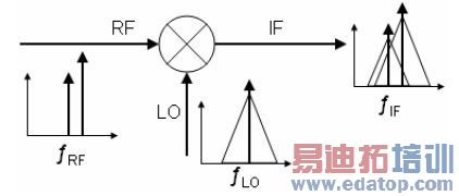 RF 仪器相位噪声的重要性取决于应用本身。 如要侦测接近特定重要信号的低阶遮蔽信号,就会需要密集的相位噪声。 使用具有大量相位噪声的LO 时,相位噪声就会在之后的IF 信号中变大。 图4 为LO 相位噪声转换至后续IF 信号的相位噪声。