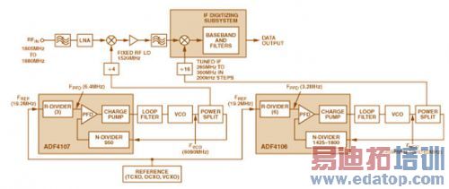 图1所示的是最通用的的接收机架构的功能框图(超外差接收机)。这里所示出的系统是满足DCS1800移动电话标准接收机的典型结构。在该标准中,接收(Rx)频段是1805MHz~1880MHz。