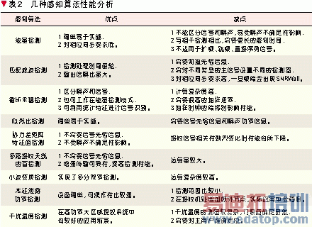 以上这些算法都是对主用户发射端信号的直接检测,基本都是从经典的信号检测理论中移植过来的。此外,近期一些文献从主用户接收端的角度提出了本振泄露功率检测和基于干扰温度的检测。有些文献对经典算法进行了改进,如文献[2]提出了一种基于能量检测-循环特征检测结合的两级感知算法。文献[3]研究了基于频偏补偿的匹配滤波器检测、联合前向和参数匹配的能量检测、多分辨率频谱检测和基于小波变换频谱检测等。表2归纳了文献中提及较多的一些感知算法,并对其优缺点进行了比较。