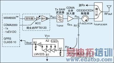 图2中的射频发射电路架构可以用于很多种不同的CDMA芯片组。图3是一个为CDMA20001X或EV-DO单波段手持设备发射功率检测而推荐的LMV225应用简图。在这种发射器结构中,输出到天线的功率为: