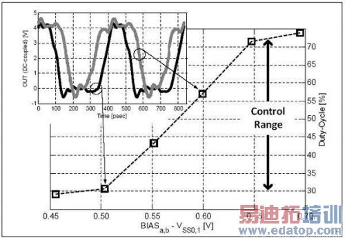 CMOS驱动器的总体芯片面积为1.99mm2,而工作面积(EDMOS和缓冲器)仅为0.16mm2.将原型裸片安装于PCB上以便于测试,并在50Ω的负载环境下进行测量。使用高速数字采样示波器可捕捉时域信号。图2显示了在3V、5V、7V和9V的供电电压下,且输入正弦波为2.1GHz时,驱动器DC耦合输出的时域波形。在50Ω负载和9V电源下所测量的最大摆幅为8.04Vpp.测量到的驱动器导通电阻低至4.6Ω。图3显示了测量到的脉冲宽度(以占空比表示)控制范围,以DC偏置电平(即BIASa,b-VSS0,1)的函数表示。该图还显示了不同占空比条件下的两种时域波形。在2.4GHz频率和5V电源下可观察到占空比控制范围为30.7%至71.5%.在高达3.6GHz的频率下,RF驱动器将其脉冲波形保持为8Vpp.在2.4GHz下进行的另一项测量表明,在5V和9V电源下连续工作24小时后,性能并未发生下降。