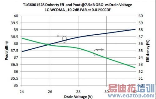 Doherty 放大器采用Taconic 公司的RF35B 印刷电路板材料,厚度为 16.6 毫米(H)、介电常数 3.66(εr)。 输入区域设计有3dB 的分配器电路,用于分离输入信号并输入到载波放大器(上行路径)和峰值放大器(下行路径)。其中载波放大器的偏压属于AB 类,其静态漏极电流( Idq)为100 mA;而峰值放大器的偏压属于C 模式。因这两种放大器的运行模式不同,故他们的输出阻抗相异。因此,他们的输出匹配电路稍有差异。 当设计一个Doherty 放大器,理想的设计是Zopt 负载阻抗等于最大的Psat 点,负载阻抗在2* Zopt 等于最高效率点。但由于T1G6001528-Q3 是一个宽带的通用设备, 并非特地针对2.65 GHz 的Doherty 放大器而设计,而且其最大效率点不在其最大饱和功率的2:1 电压驻波比(VSWR)圆上。当我们在设计这个Doherty 放大器,我们不得不妥协在 Zopt 和2* Zopt 的负载阻抗。这意味着这意味着Zopt 阻抗负载不在最大饱和功率点上,2* Zopt 阻抗负载不在最大效率点上。 IV. DOHERTY 放大器性能 如图3 所示,采用T1G6001528-Q3 器件的Doherty 放大器,在多种信号波形下进行了详细测试,证明其性能满足要求基站应用。 如图5 所示,AM/AM 和AM/PM 曲线,这是DPD 校正性能的一个关键参数。在一个典型的一般LDMOS 器件Doherty 放大器,当输入功率的增加,相位单调下降,这将降低DPD 校正性能。但此采用T1G6001528-Q3 放大器, 输入电源的相位变化是完全不同的,有利于DPD 的校正。 如图6 所示,PAR 及效率随输出功率的变化, 频率为2.65 GHz,WCDMA 信号在0. 01% CCDF 时的 PAR 为10.2 dB。 如图7 所示, LTE 高功率性能, 在2.62 GHz ~2.69 GHz 之间,量测的信号为WCDMA 波形,测试数据为38 dBm 的平均输出功率,计算的饱和功率采用平均输出功率加上PAR 值。从本图中可以看出,在标准 LTE 频率范围(2620 MHz ~2690 MHz)内,如果平均输出功率为38 dBm, 输出效率超过55%。 根据现代基站的设计,射频功率放大器的输出功率 要求因不同特定地域的电话呼叫用户的数量不同而显现差异。这种要求我们称之为“流量管制”。 一般而言,为使基站保持高效运行,需要调整射频功率放大器的工作电压, 以实现不同的输出功率,并要求基站射频功率放大器能够在工作电压变化时提供稳定的效率。如图8 所示,漏极电压范围为24V ~ 32V,采用同样的WCDMA 波形和 PAR (7.5 dB),效率与平均输出功率电压的变化 。