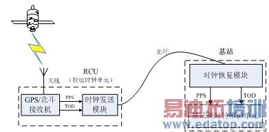 针对传统卫星授时系统存在的问题,为适应更广泛的布站场景,中国移动联合大唐移动创造性的提出了一体化卫星授时优化系统解决方案。一体化主要是指GPS/北斗光纤拉 远设计,天面部分将GPS/北斗天线与接收机一体化设计,接收机输出的PPS与TOD通过光纤拉远的方法传输给基站Node B。Node B时钟恢复模块恢复PPS和TOD,并且传送到Node B需要同步的模块。基站设计不再需要考虑接收机的类型(GPS/北斗)、型号、厂家、尺寸等一系列问题,只需要Node B和拉远接收机有相同的接口标准和时间传输机制。