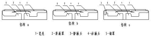 真空灭弧室小型化后,内部各结构件的尺寸、形状及其相互位置关系对内部绝缘水平的影响非常大,下面针对几种不同的结构进行分析,结构示意图如图3所示。