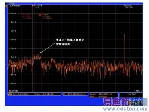 图 9. 在使用升压转换器时来自数字电路板的宽频谱噪声。