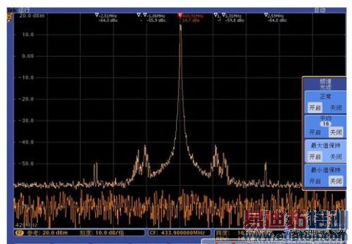 从图中可见在板上供电FPGA驱动的射频信号输出的频率周围出现的不该出现的寄生干扰(图2),而电池供电的单片机驱动的射频信号却很干净(图3)。而输出功率都在-15dBm左右,相差不大!