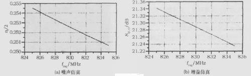根据噪声系数的级连公式NFtot(m)=NF1+(N F2-1)/A v1+…+(N Fm-1)/Av1…A v(m-1) (其中NFtot (m)为m级总的噪声系数、NFm为第m级的噪声系数、Avm为第m级的增益。),整个放大器的噪声系数主要由第一级和第二级所决定。具有低噪声和高增益的第一级和第二级放大器的设计是整个低噪声放大器设计的难点。使用Agilent的Advanced Design System(ADS)对AMP1和AMP2进行噪声和增益的S参数仿真,得到的结果如图2和图3所示。