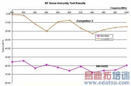 两个双运放(MAX4232和X)的测试结果如图3所示,测量值为输出的平均dBV。RF频率在800MHz至1GHz范围内变化时,在均匀的60V/m电场中,MAX4232的平均输出大约为-66dBV(500(V RMS相对于1V);器件X的平均输出大约为(18dBV(125mV RMS相对于1V)。没有RF信号时,电压表的读数为-86dBV。