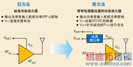 使用DC-DC转换器(功率放大器电源稳压器)的主要目的是减少分母中的Pdc因子。当功率放大器与电池直接相连时,Pdc=Vbatt*Ibatt,而当它使用功率放大器电源稳压器供电时,Pdc=V o*I o。现在我们能够看出,为了增加PAE,V o和Io 必须低于Vbatt和Ibatt。这可以通过降低发射的射频功率电平,降低功率放大器电源稳压器的输出电压来实现。这样也降低了Io (功率放大器的吸收电流),并且由于DC-DC转换器的高效性,电池的输出电流也会降低。